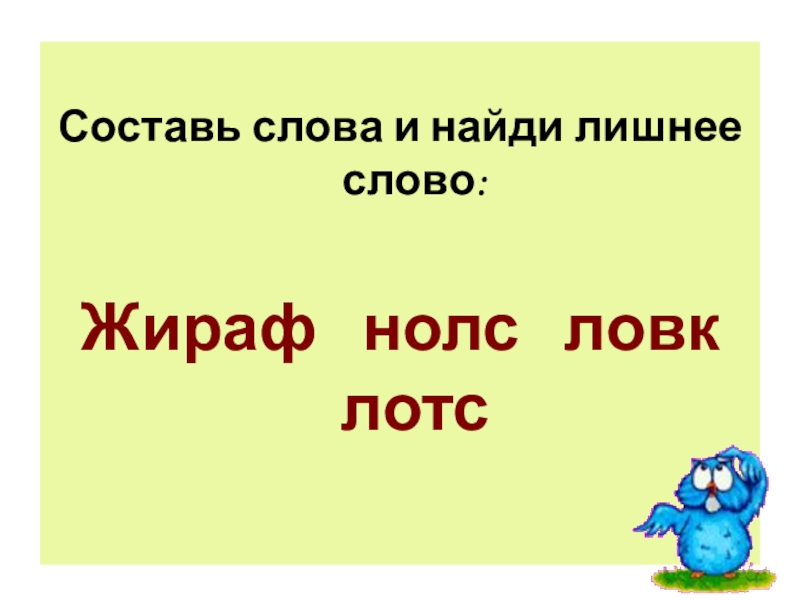Составь слова и найди лишнее слово:Жираф  нолс  ловк  лотс