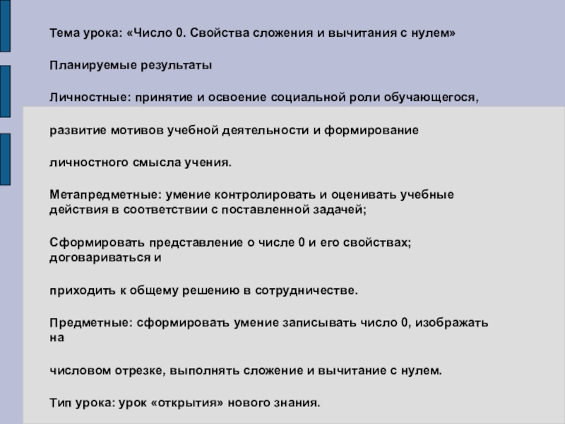 Тема урока: «Число 0. Свойства сложения и вычитания с нулем»Планируемые результатыЛичностные: принятие и освоение социальной роли обучающегося,развитие