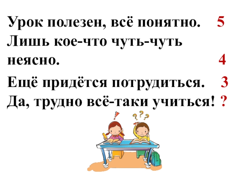 Слайд 15Урок полезен, всё понятно. 5 Лишь кое-что чуть-чуть неясно.