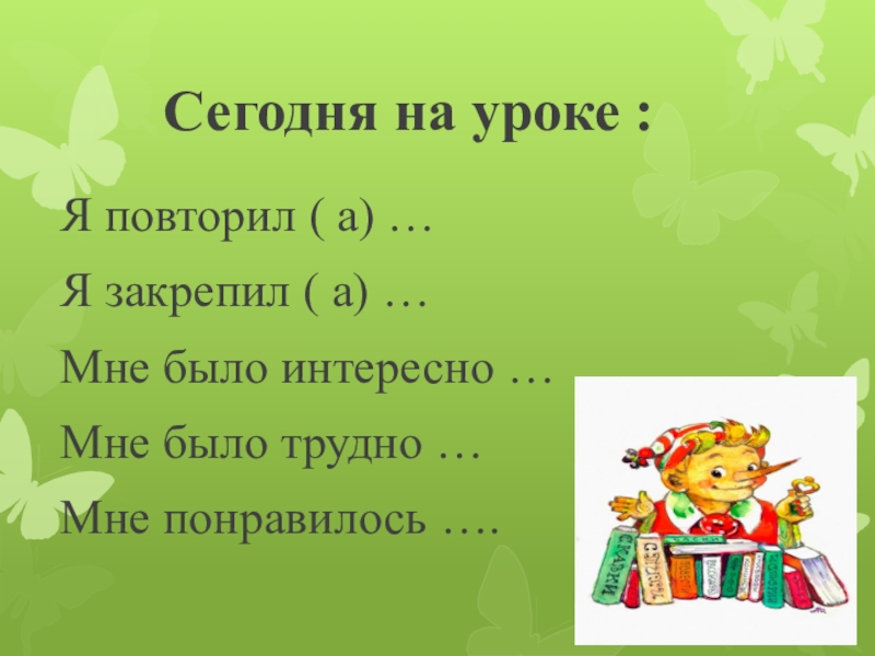 Сегодня на уроке :Я повторил ( а) …Я закрепил ( а) …Мне было интересно …Мне