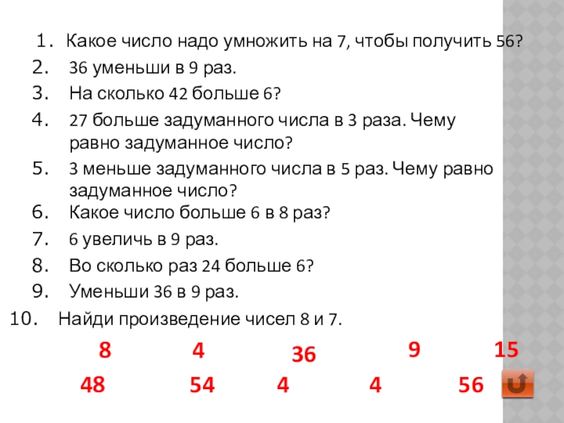 Найди произведение чисел 8 и 7.