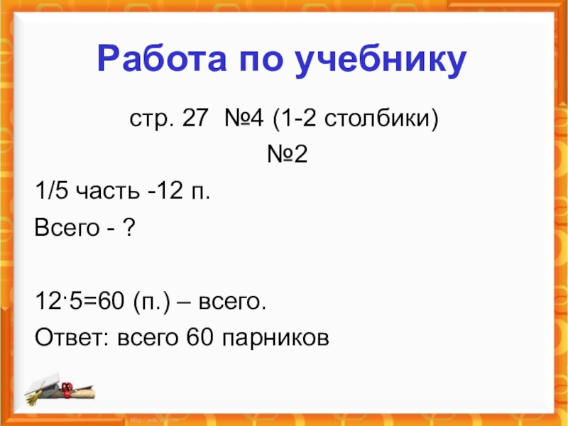 Работа по учебнику стр. 27 №4 (1-2 столбики) №2 1/5 часть -12 п.Всего - ?12·5=60 (п.) –