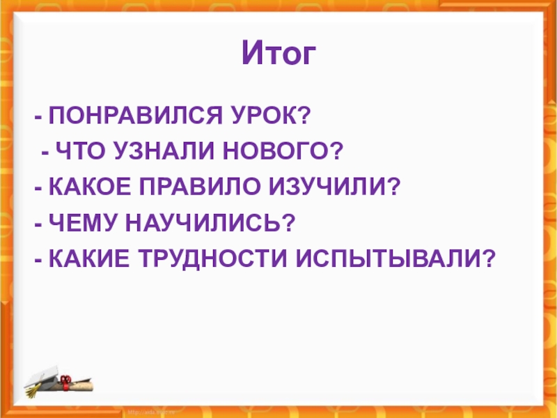 Итог- ПОНРАВИЛСЯ УРОК? - ЧТО УЗНАЛИ НОВОГО?- КАКОЕ ПРАВИЛО ИЗУЧИЛИ?- ЧЕМУ НАУЧИЛИСЬ?- КАКИЕ ТРУДНОСТИ ИСПЫТЫВАЛИ?
