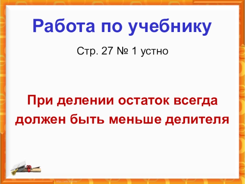 Стр. 27 № 1 устно При делении остаток всегда должен быть меньше делителяРабота по учебнику