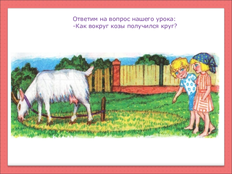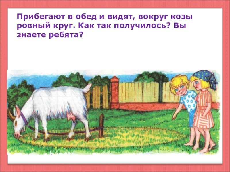 Слайд 3Прибегают в обед и видят, вокруг козы ровный круг. Как так