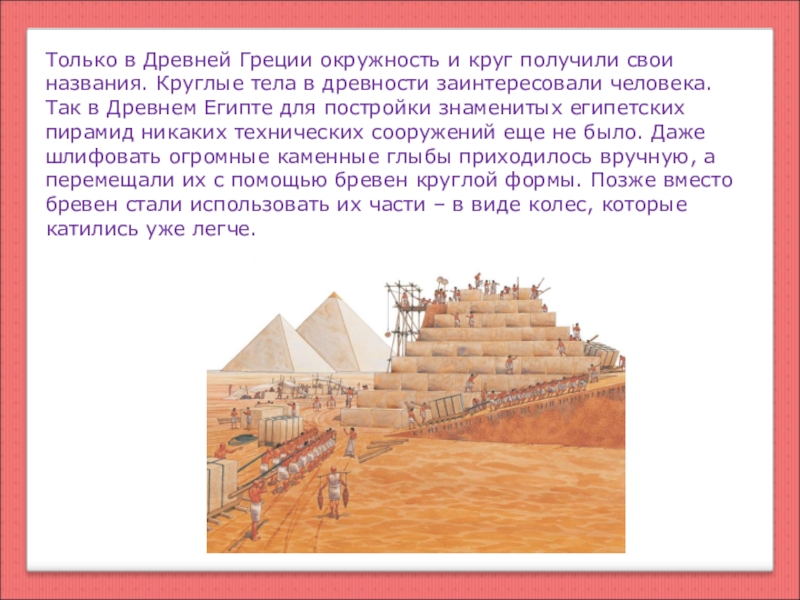 тела в древности заинтересовали человека. Так в Древнем Египте для постройки знаменитых египетских пирамид никаких технических сооружений еще не было. Даже шлифовать огромные каменные глыбы приходилось вручную, а перемещали их с помощью бревен круглой формы. Позже вместо бревен стали использовать их части – в виде колес, которые катились уже легче.