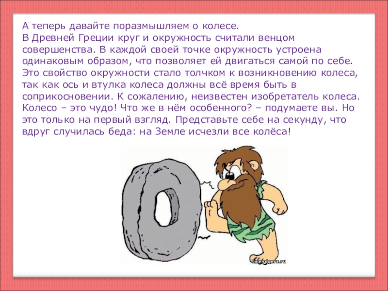 окружность считали венцом совершенства. В каждой своей точке окружность устроена одинаковым образом, что позволяет ей двигаться самой по себе. Это свойство окружности стало толчком к возникновению колеса, так как ось и втулка колеса должны всё время быть в соприкосновении. К сожалению, неизвестен изобретатель колеса. Колесо – это чудо! Что же в нём особенного? – подумаете вы. Но это только на первый взгляд. Представьте себе на секунду, что вдруг случилась беда: на Земле исчезли все колёса!