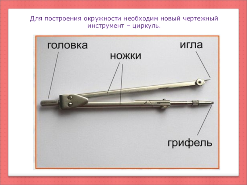 Слайд 12Для построения окружности необходим новый чертежный инструмент – циркуль.