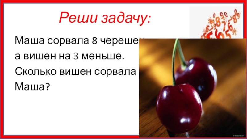 Реши задачу:Маша сорвала 8 черешен,а вишен на 3 меньше.Сколько вишен сорвалаМаша?