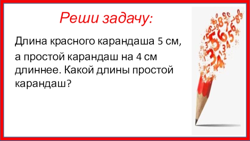 Реши задачу:Длина красного карандаша 5 см,а простой карандаш на 4 см длиннее. Какой длины простой карандаш?