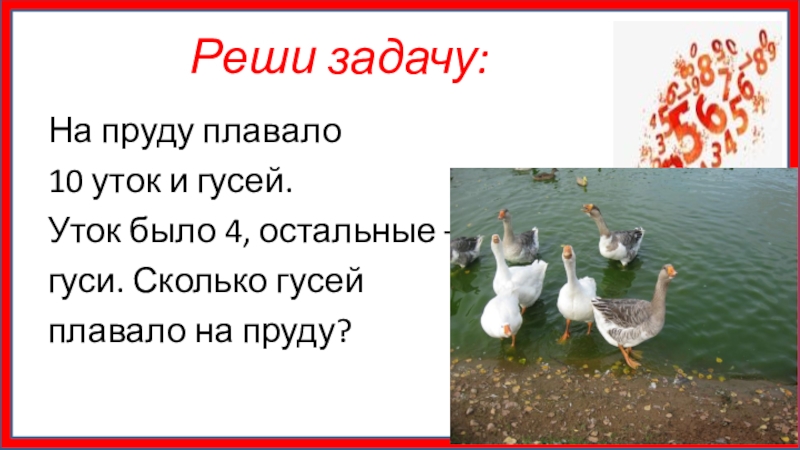 Реши задачу:На пруду плавало10 уток и гусей.Уток было 4, остальные – гуси. Сколько гусейплавало на пруду?