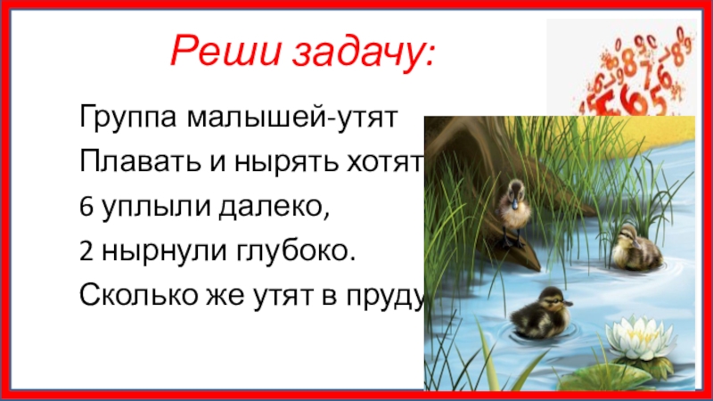 Реши задачу:   Группа малышей-утят   Плавать и нырять хотят.   6 уплыли далеко,
