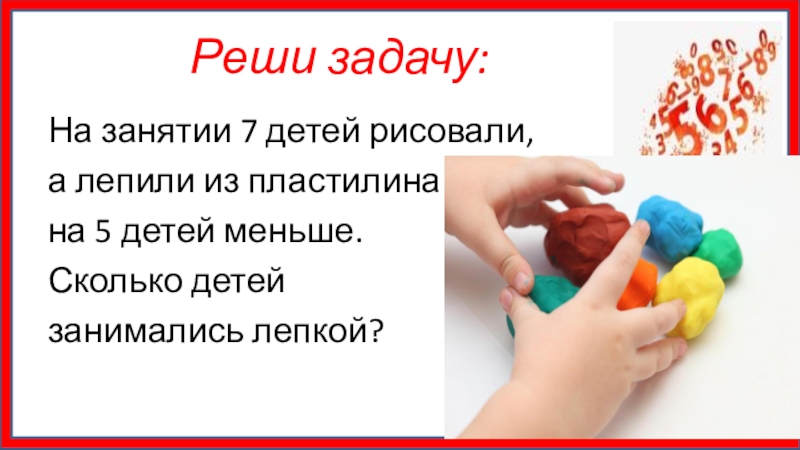 Реши задачу:На занятии 7 детей рисовали, а лепили из пластилина на 5 детей меньше.Сколько детей занимались лепкой?