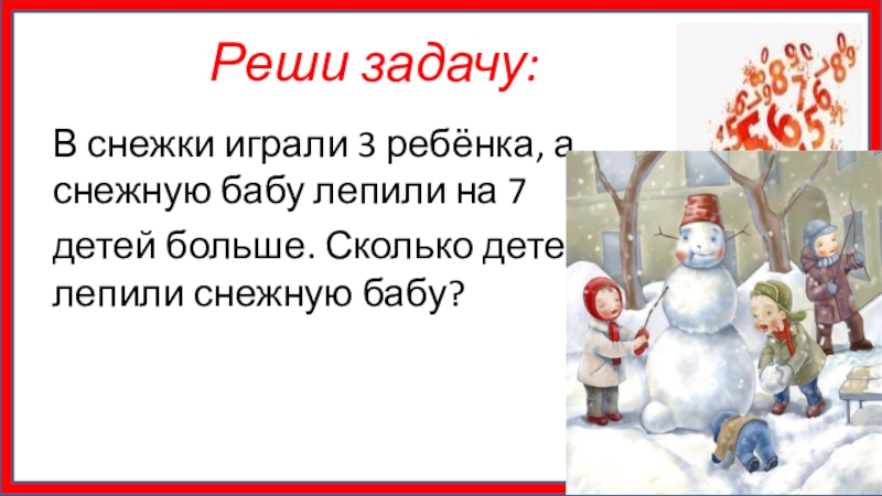 Реши задачу:В снежки играли 3 ребёнка, а снежную бабу лепили на 7 детей больше. Сколько детей лепили