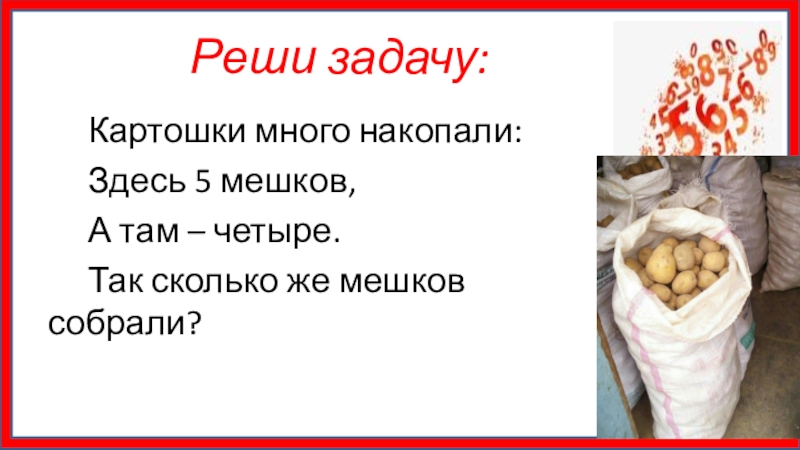 Реши задачу: Картошки много накопали: Здесь 5 мешков, А там – четыре. Так сколько же мешков собрали?