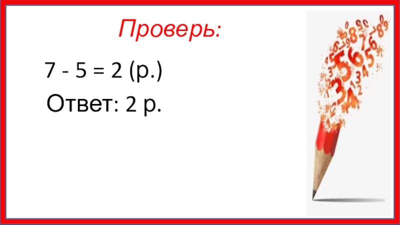 Проверь:   7 - 5 = 2 (р.)  Ответ: 2 р.
