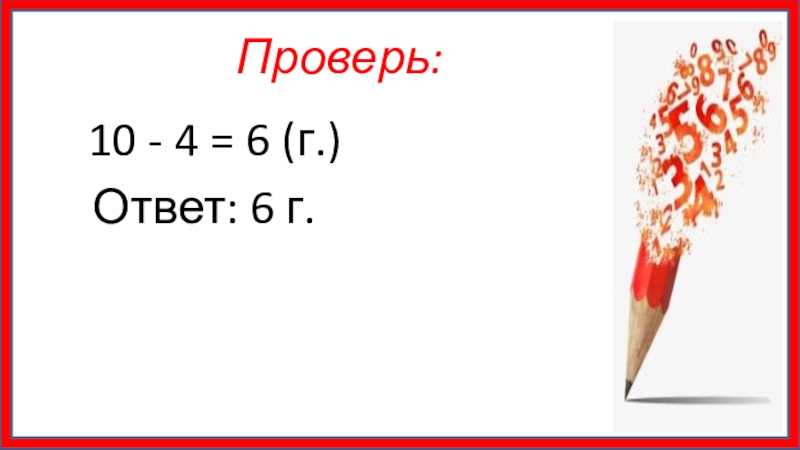 Проверь:   10 - 4 = 6 (г.)  Ответ: 6 г.