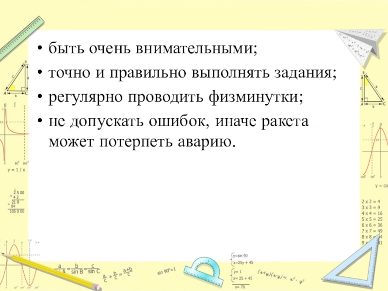 быть очень внимательными;точно и правильно выполнять задания;регулярно проводить физминутки;не допускать ошибок, иначе ракета может потерпеть аварию.