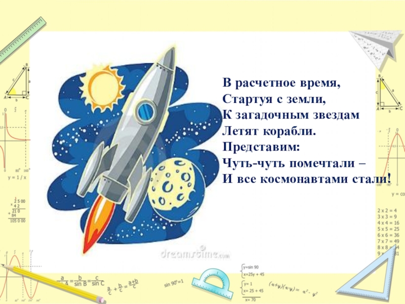Слайд 3В расчетное время, Стартуя с земли, К загадочным звездам  Летят корабли. Представим: Чуть-чуть помечтали – И все