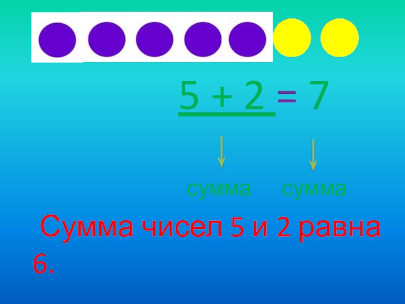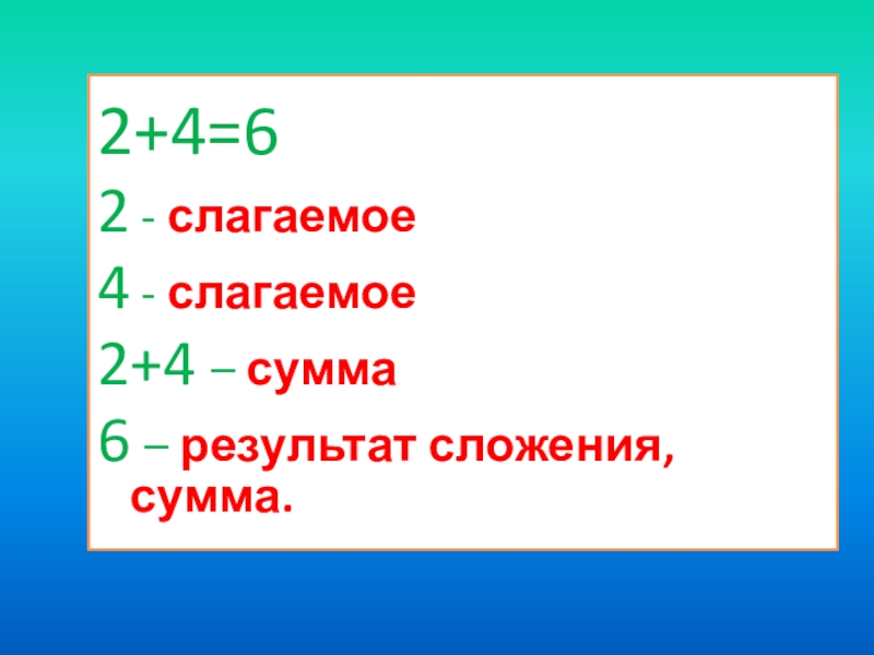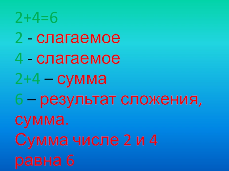 2+4=62 - слагаемое4 - слагаемое2+4 – сумма6 – результат сложения, сумма.Сумма числе 2 и 4 равна 6