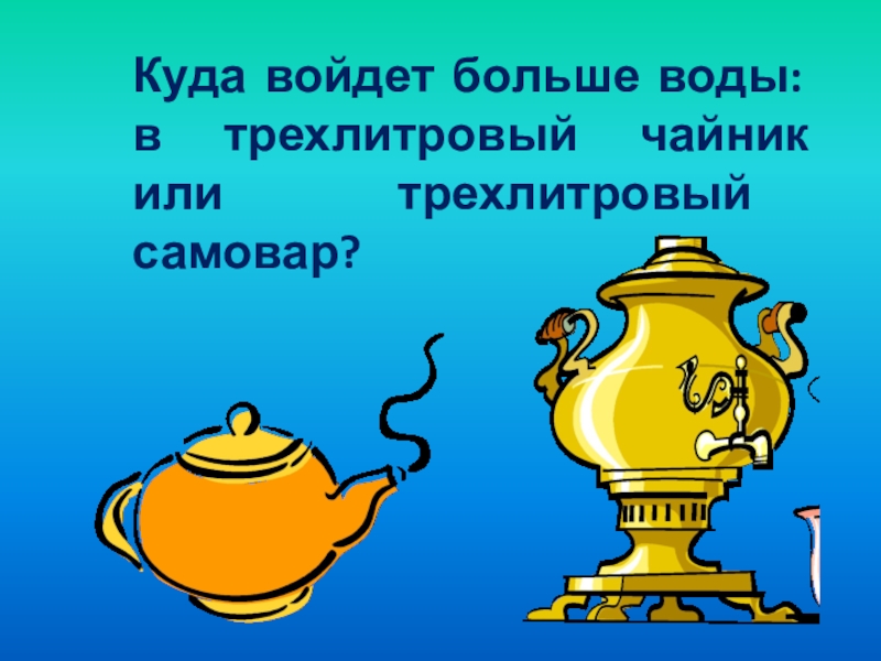 Слайд 5Куда войдет больше воды: в трехлитровый чайник или трехлитровый самовар?