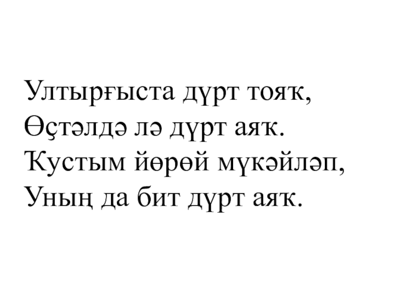 Слайд 6Ултырғыста дүрт тояҡ, Өҫтәлдә лә дүрт аяҡ. Ҡустым йөрөй мүкәйләп, Уның да бит дүрт