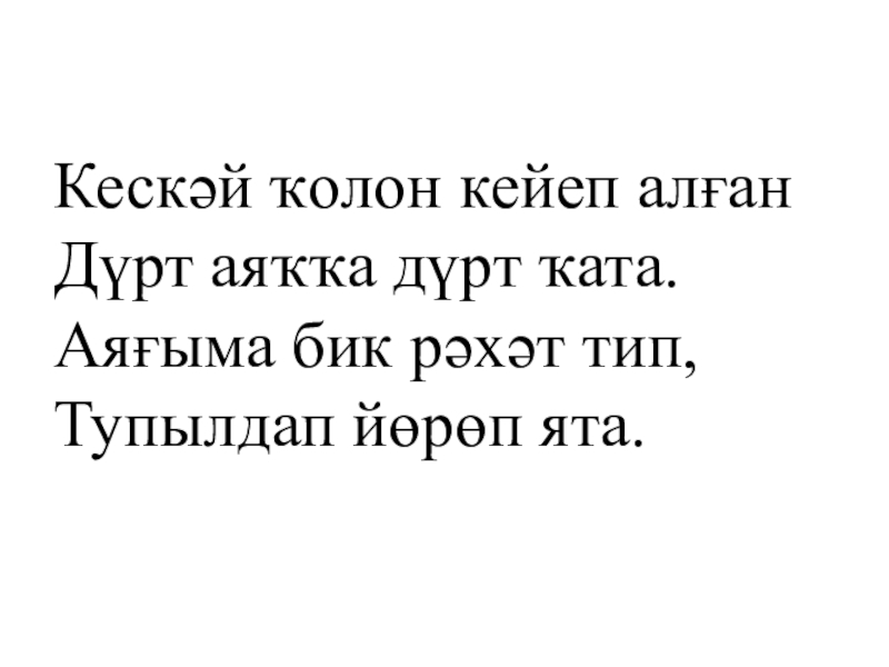 Слайд 4Кескәй ҡолон кейеп алған Дүрт аяҡҡа дүрт ҡата. Аяғыма бик рәхәт тип, Тупылдап йөрөп