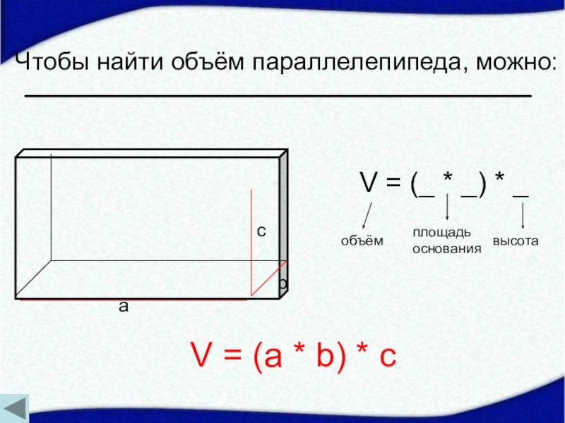 V = (4 * 3) * 2 = 24 дм