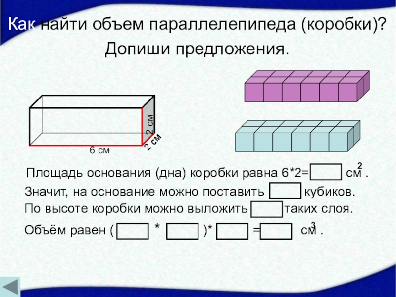 Площадь основания (дна) коробки равна 6*2= см .