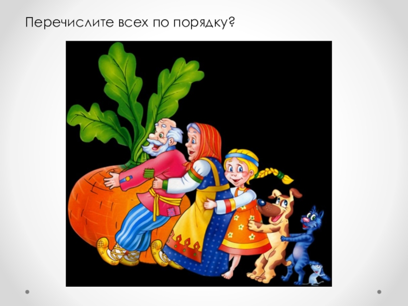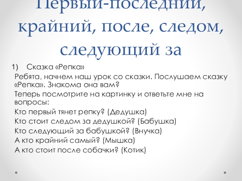 Первый-последний, крайний, после, следом, следующий заСказка «Репка»Ребята, начнем наш урок со сказки. Послушаем сказку «Репка». Знакома она вам?Теперь посмотрите на картинку и ответьте мне на вопросы:Кто первый тянет репку? (Дедушка)Кто стоит следом за дедушкой? (Бабушка)Кто следующий