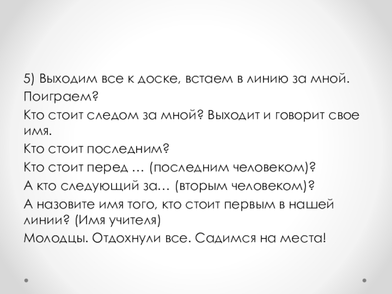 5) Выходим все к доске, встаем в линию за мной.Поиграем?Кто стоит следом за мной? Выходит и говорит