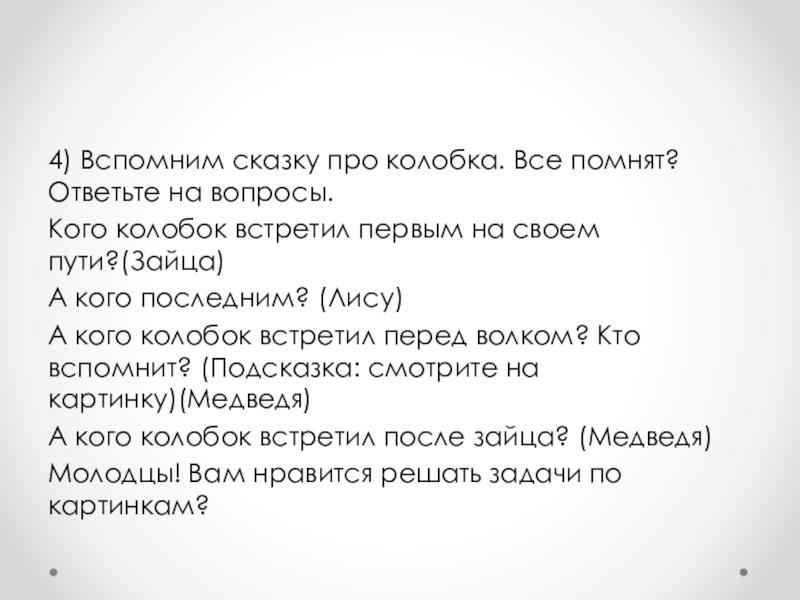 4) Вспомним сказку про колобка. Все помнят? Ответьте на вопросы.Кого колобок встретил первым на своем пути?(Зайца)А кого