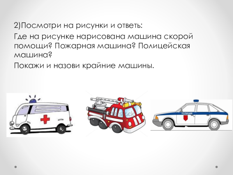 2)Посмотри на рисунки и ответь:Где на рисунке нарисована машина скорой помощи? Пожарная машина? Полицейская машина?Покажи и назови