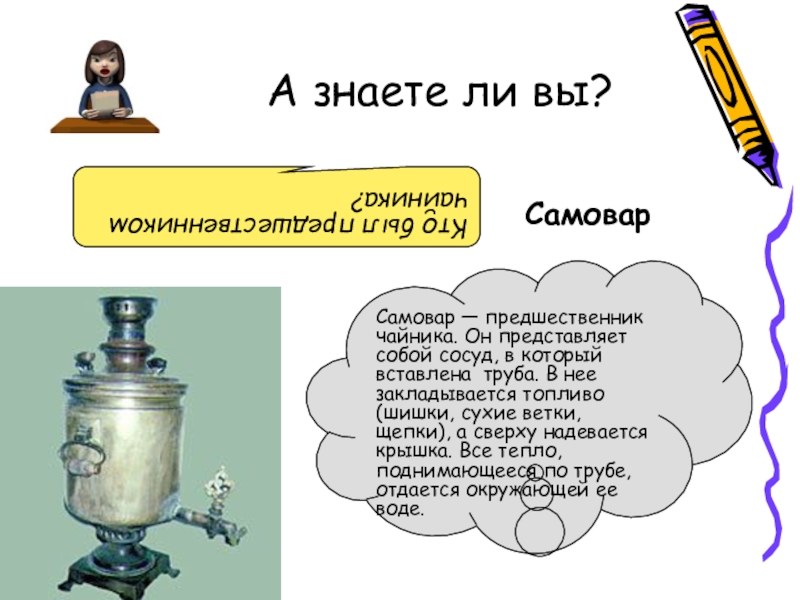 Самовар — предшественник чайника. Он представляет собой сосуд, в который вставлена труба. В нее закладывается топливо (шишки, сухие ветки, щепки), а сверху надевается крышка. Все тепло, поднимающееся по трубе, отдается окружающей ее воде.