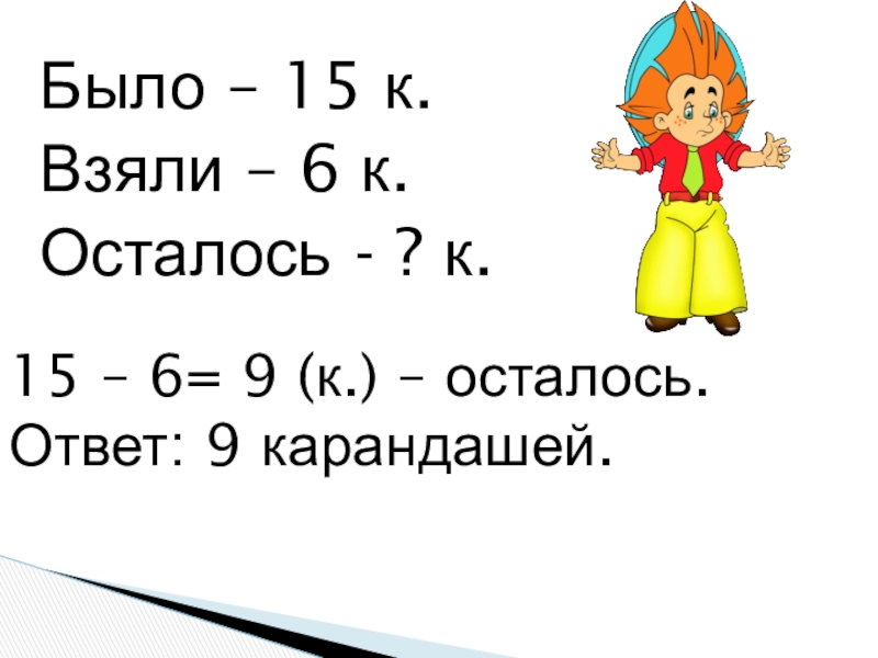Было – 15 к.Взяли – 6 к.Осталось - ? к.15 – 6= 9 (к.) – осталось.Ответ: 9