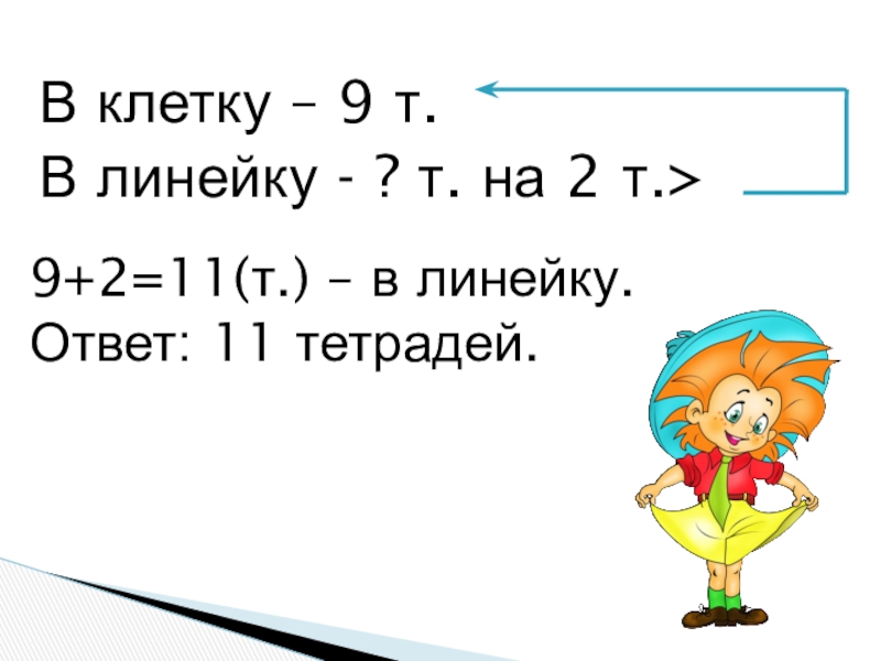 В клетку – 9 т.В линейку - ? т. на 2 т.>9+2=11(т.) – в линейку.Ответ: 11 тетрадей.