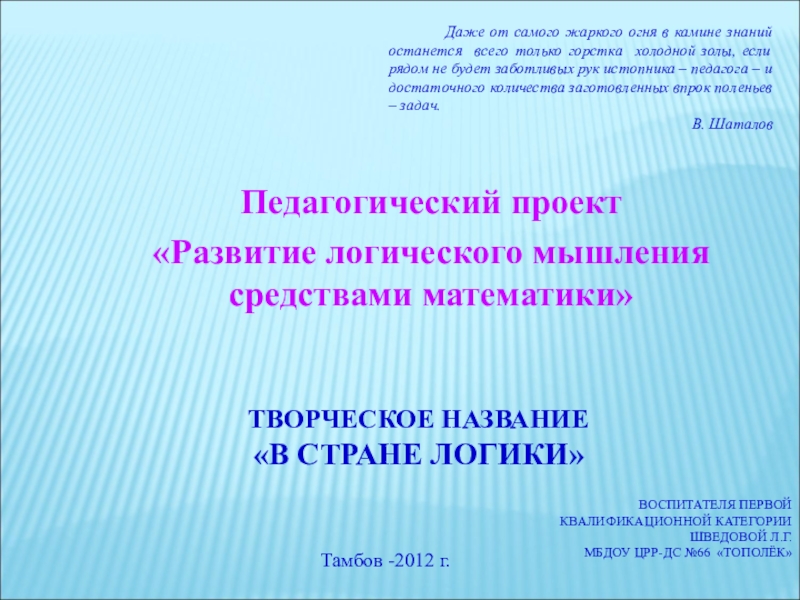 Даже от самого жаркого огня в камине знаний останется всего только горстка холодной золы, если рядом не будет заботливых рук истопника – педагога – и достаточного количества заготовленных впрок поленьев – задач.