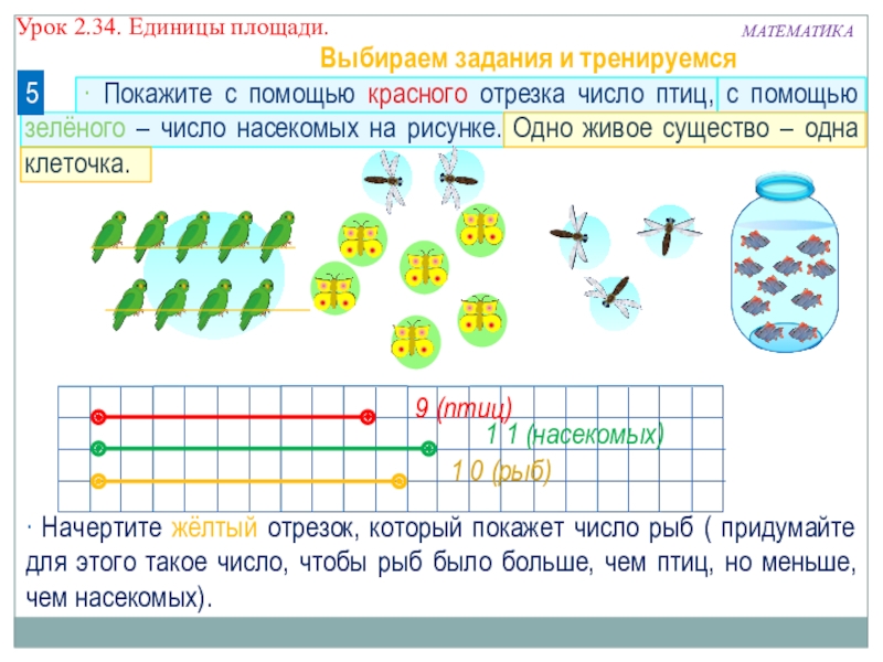 Начертите жёлтый отрезок, который покажет число рыб ( придумайте для этого такое число, чтобы рыб было больше, чем птиц, но меньше, чем насекомых).