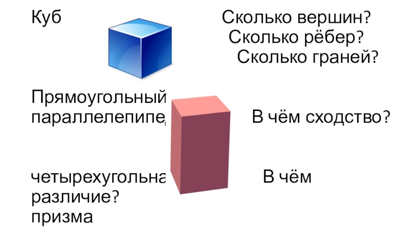 Сколько вершин? Сколько рёбер? Сколько граней? Прямоугольный параллелепипед В чём сходство? четырехугольная В чём различие? призма