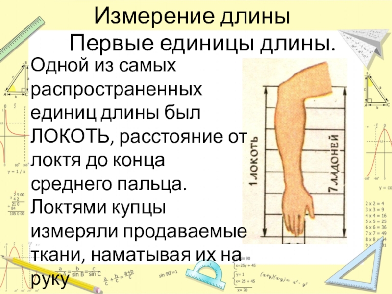 Измерение длиныПервые единицы длины. Одной из самых распространенных единиц длины был ЛОКОТЬ, расстояние от локтя до конца