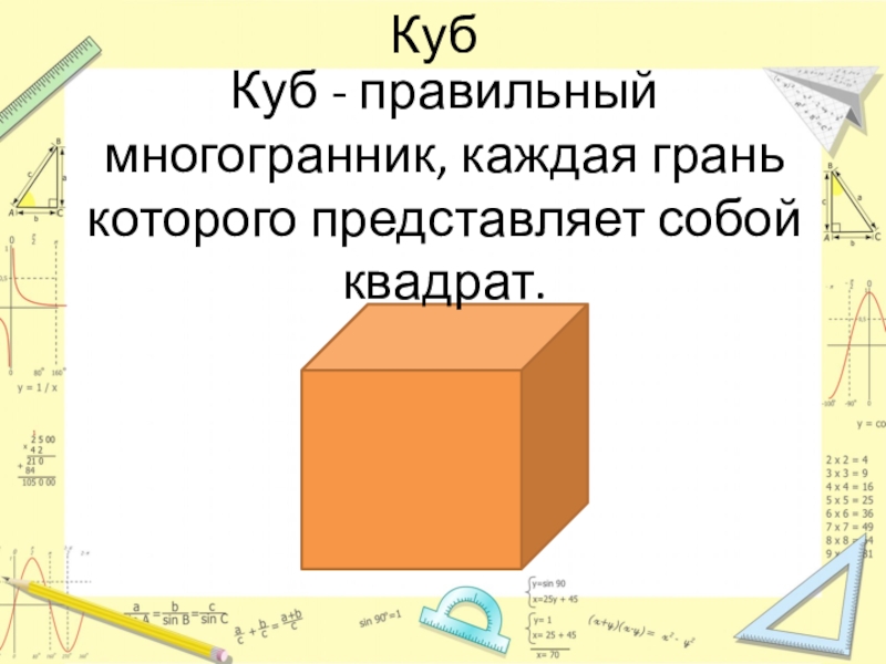 КубКуб - правильный многогранник, каждая грань которого представляет собой квадрат.