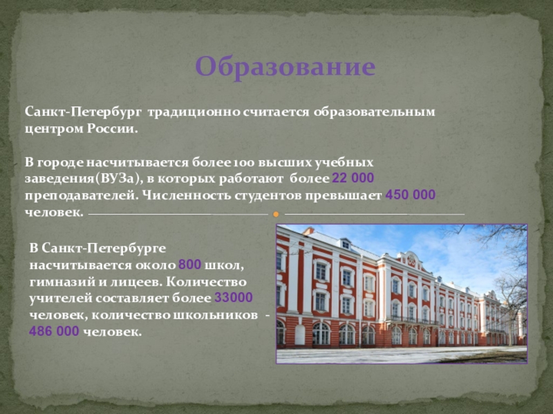 В Санкт-Петербурге насчитывается около 800 школ, гимназий и лицеев. Количество учителей составляет более 33000 человек, количество школьников - 486 000 человек.