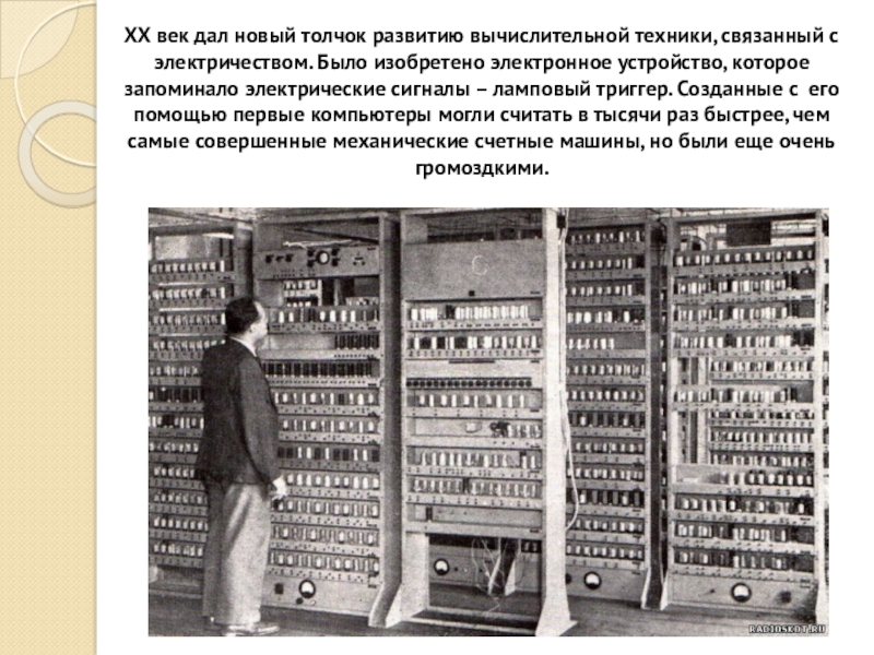 Слайд 7XX век дал новый толчок развитию вычислительной техники, связанный с электричеством.