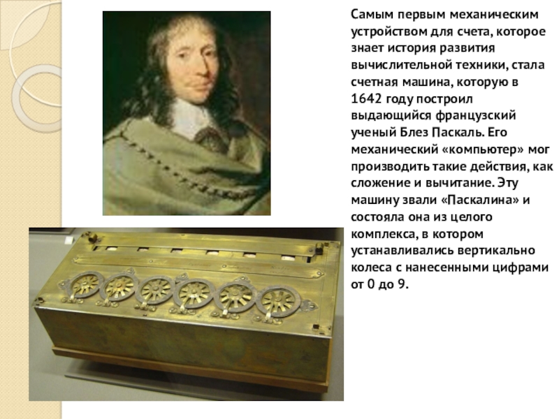 техники, стала счетная машина, которую в 1642 году построил выдающийся французский ученый Блез Паскаль. Его механический «компьютер» мог производить такие действия, как сложение и вычитание. Эту машину звали «Паскалина» и состояла она из целого комплекса, в котором устанавливались вертикально колеса с нанесенными цифрами от 0 до 9.