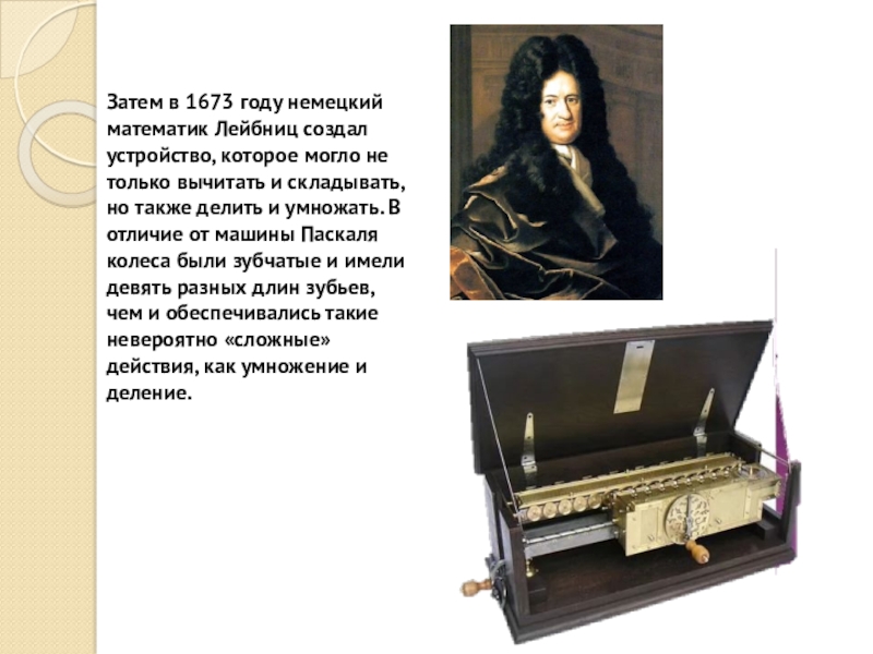 Слайд 5Затем в 1673 году немецкий математик Лейбниц создал устройство, которое могло