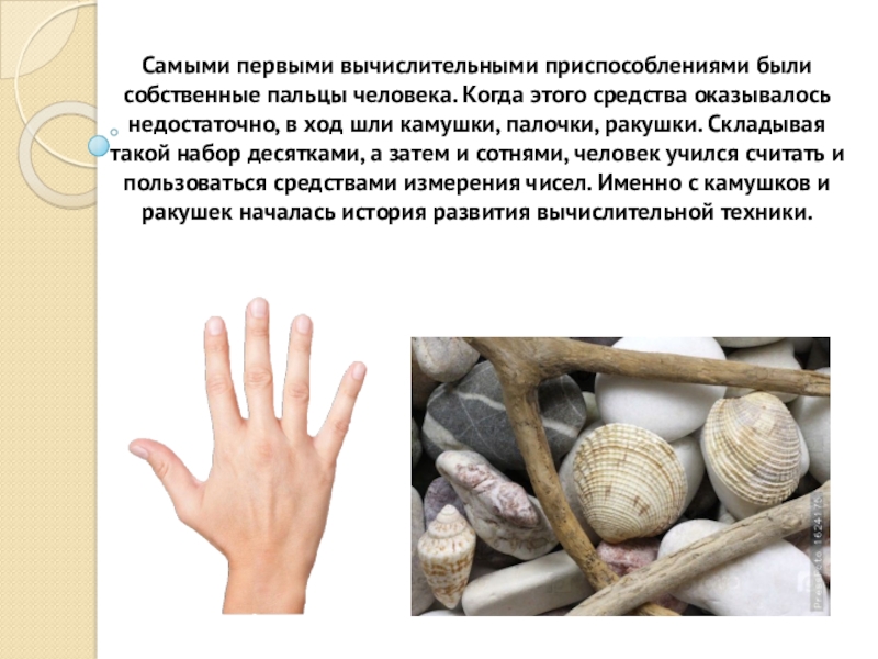 оказывалось недостаточно, в ход шли камушки, палочки, ракушки. Складывая такой набор десятками, а затем и сотнями, человек учился считать и пользоваться средствами измерения чисел. Именно с камушков и ракушек началась история развития вычислительной техники.