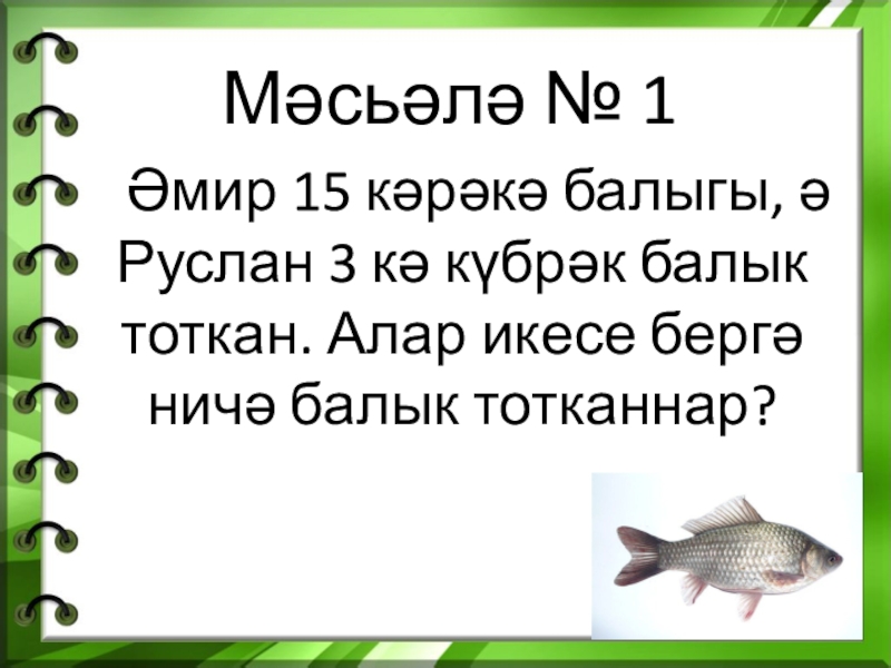 Мәсьәлә № 1   Әмир 15 кәрәкә балыгы, ә Руслан 3 кә күбрәк балык