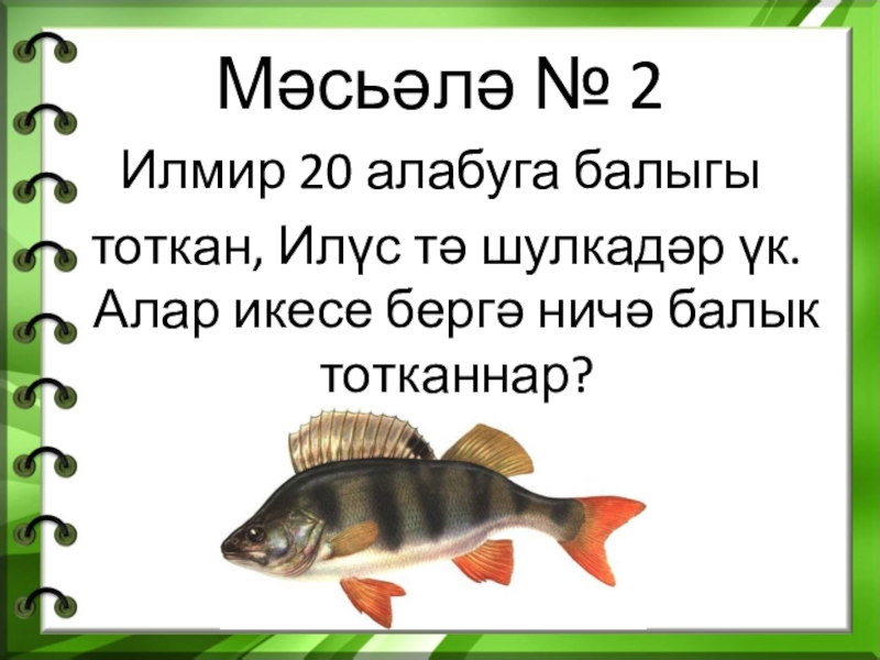 Мәсьәлә № 2Илмир 20 алабуга балыгы тоткан, Илүс тә шулкадәр үк. Алар икесе бергә ничә балык тотканнар?