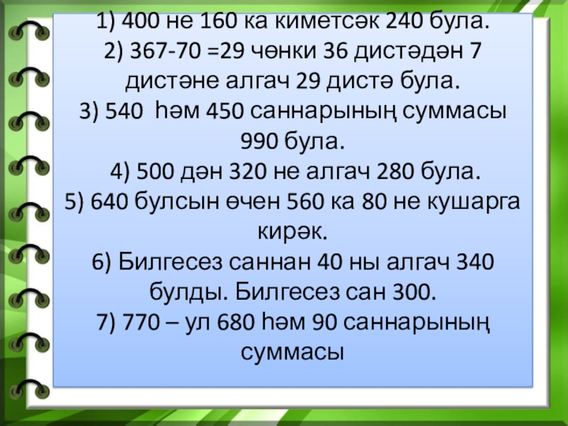 чөнки 36 дистәдән 7 дистәне алгач 29 дистә була. 3) 540 һәм 450 саннарының суммасы 990 була. 4) 500 дән 320 не алгач 280 була. 5) 640 булсын өчен 560 ка 80 не кушарга кирәк. 6) Билгесез саннан 40 ны алгач 340 булды. Билгесез сан 300. 7) 770 – ул 680 һәм 90 саннарының суммасы