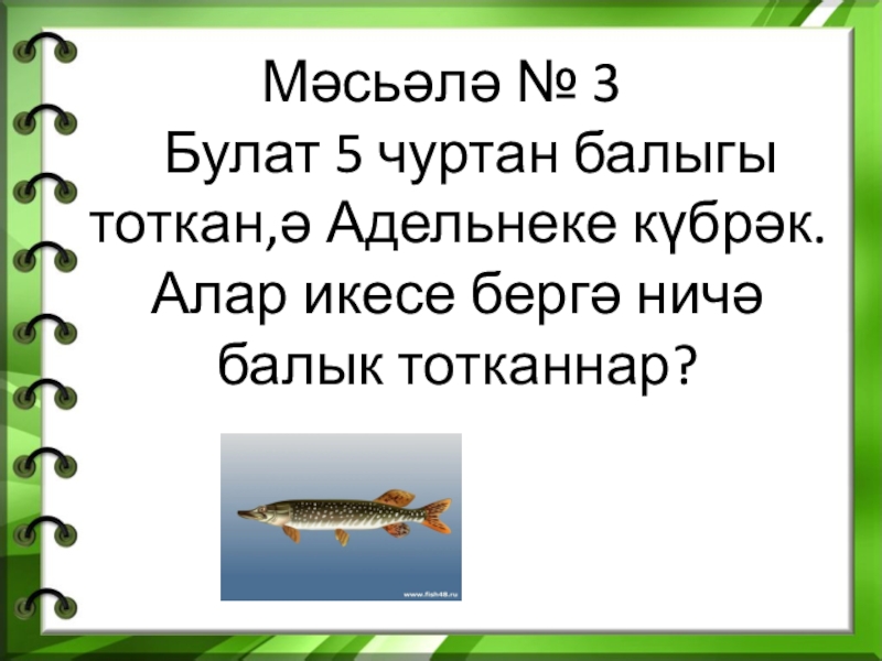 Мәсьәлә № 3  Булат 5 чуртан балыгы тоткан,ә Адельнеке күбрәк. Алар икесе бергә ничә балык